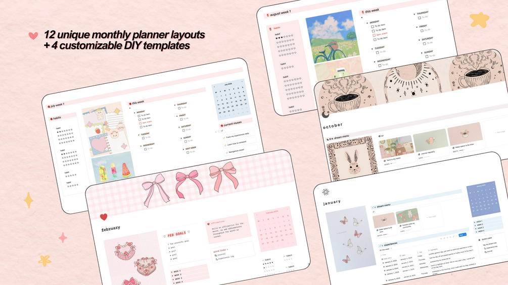 - 📒 12 unique monthly planner layouts, plus 4 blank DIY templates for you to easily customize your own
