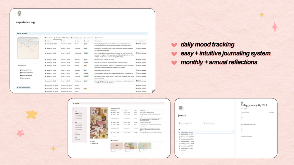 Note: The experience tracker database setup is inspired by Wesley Anna's review cycles system in her Ultimate Notion Dashboard. The Dream Life Planner's experience tracker focuses on mood tracking & memory collection, while Wesley's reviews tackle goal progress, habits & improvements. Check to see what's a good fit for you!